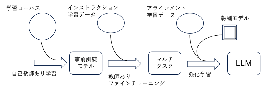 チャットボットなど、私たちが利用するアプリケーションシステムに組み込まれたLLMは、複数の学習ステージを経て開発されます(図を参照)。